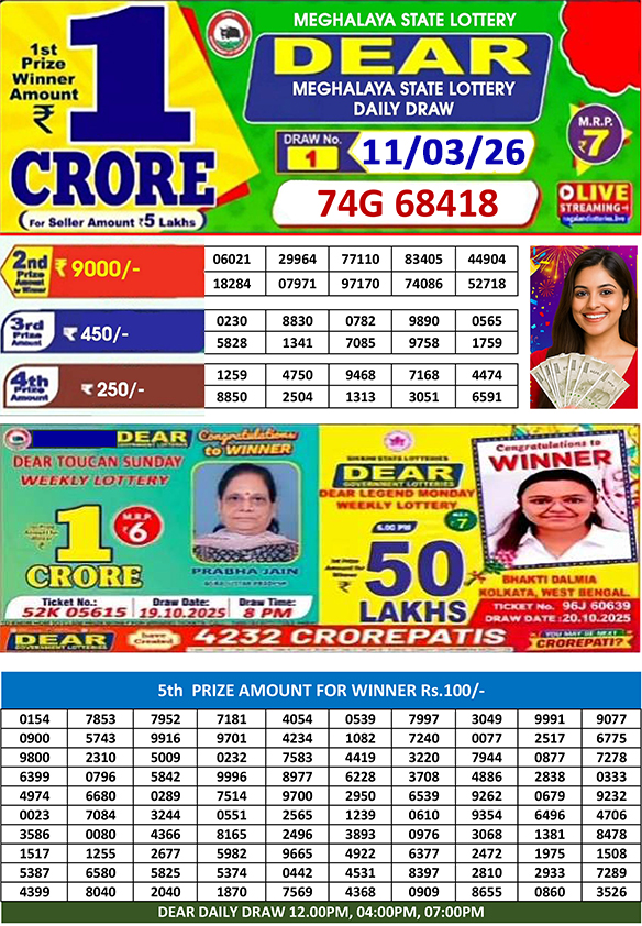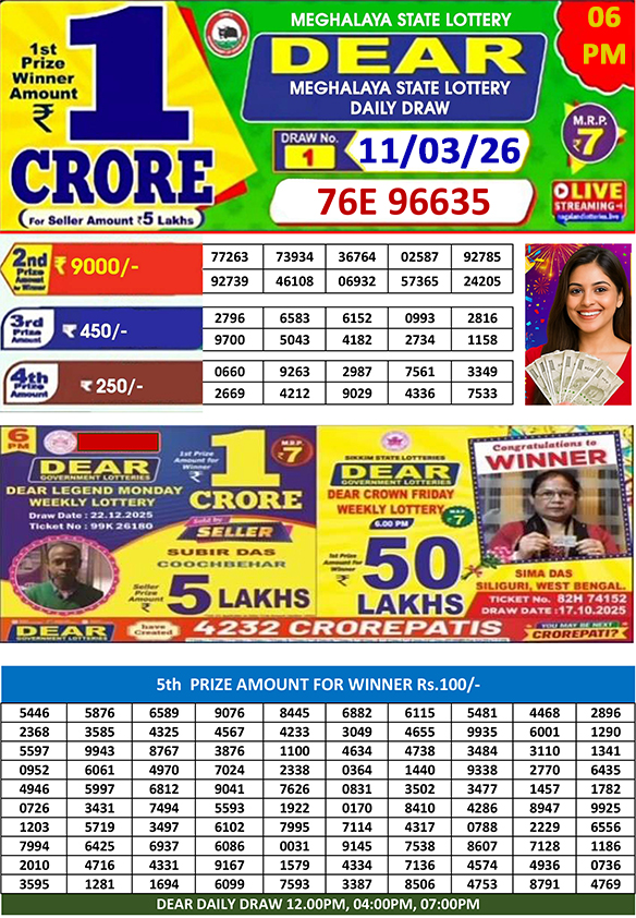 Dear lottery sambad is a government regulated lottery which gives you a chance to win a huge prize amount daily. Dear lottery sambad today results are announced at 1pm(dear lottery sambad morning), 6pm(dear lottery sambad day) and 8pm(dear lottery sambad night). Lottery sambad draws are publicly live, but if you miss any old result you can check it on our site.